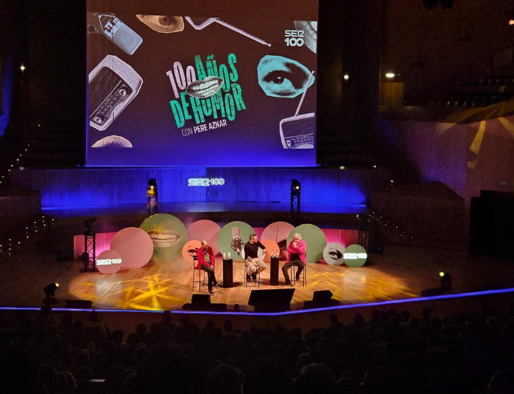 En el Auditorio de Zaragoza tuvimos el privilegio de participar en la producción técnica de la gira ‘100 años de humor’ de Pere Aznar con motivo del centenario de la Cadena SER. Más de mil quinientas personas se congregaron para atender al repaso humorístico de los 100 años de historia de la Cadena SER. Los invitados fueron los humoristas Javier Cansado y Javier Coronas. Una gran experiencia llena de cultura y humor en la que nuestros videoproyectores láser e iluminación embellecieron la gala.
